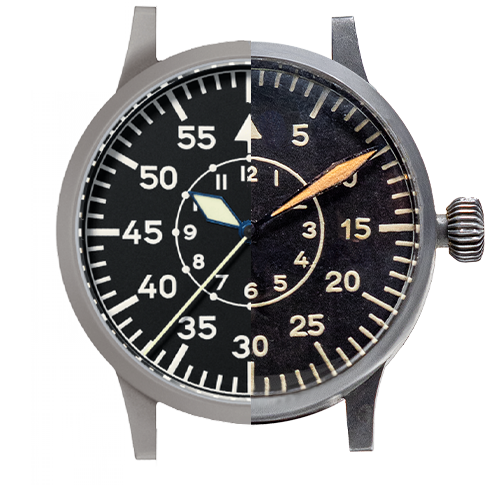 The history of Laco pilot watches dates to the 1940s, when only five selected manufacturers – IWC, Laco, Lange & Söhne, Stowa, and Wempe – were granted permission to produce pilot watches, also known as observation watches or B-Uhren (German: Beobachtungsuhr), according to the precise specifications of the German Ministry of Aviation (RLM). With an impressive diameter of 55 mm, they served as indispensable navigation instruments and set a milestone in watchmaking history, establishing a standard for precision and functionality that endures to this day.