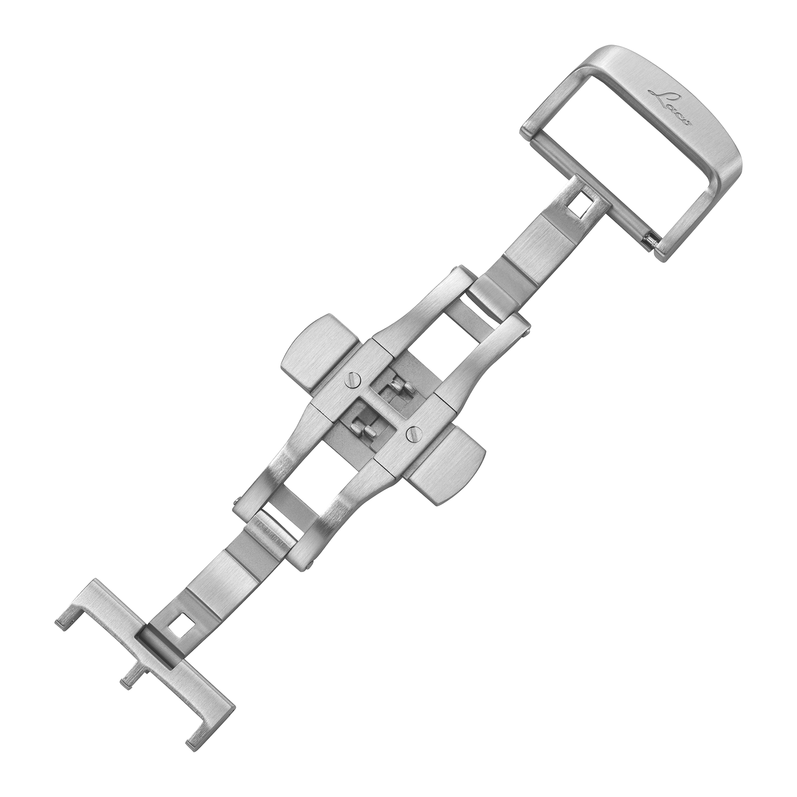 The Laco butterfly clasp made of brushed stainless steel combines a clean, understated design with practical everyday benefits. Its satin finish and discreetly engraved Laco lettering are deliberately aligned with Laco’s standard buckle design.