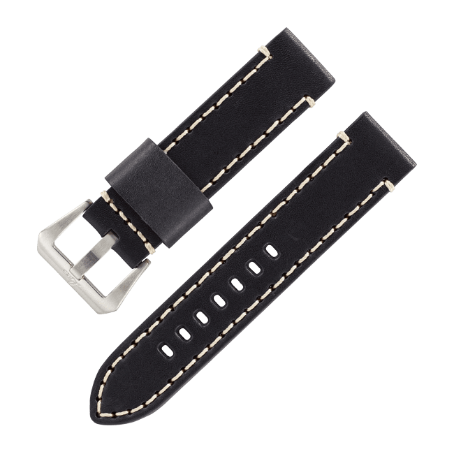 - Black calf leather strap with white stitching, 22 mm lug width