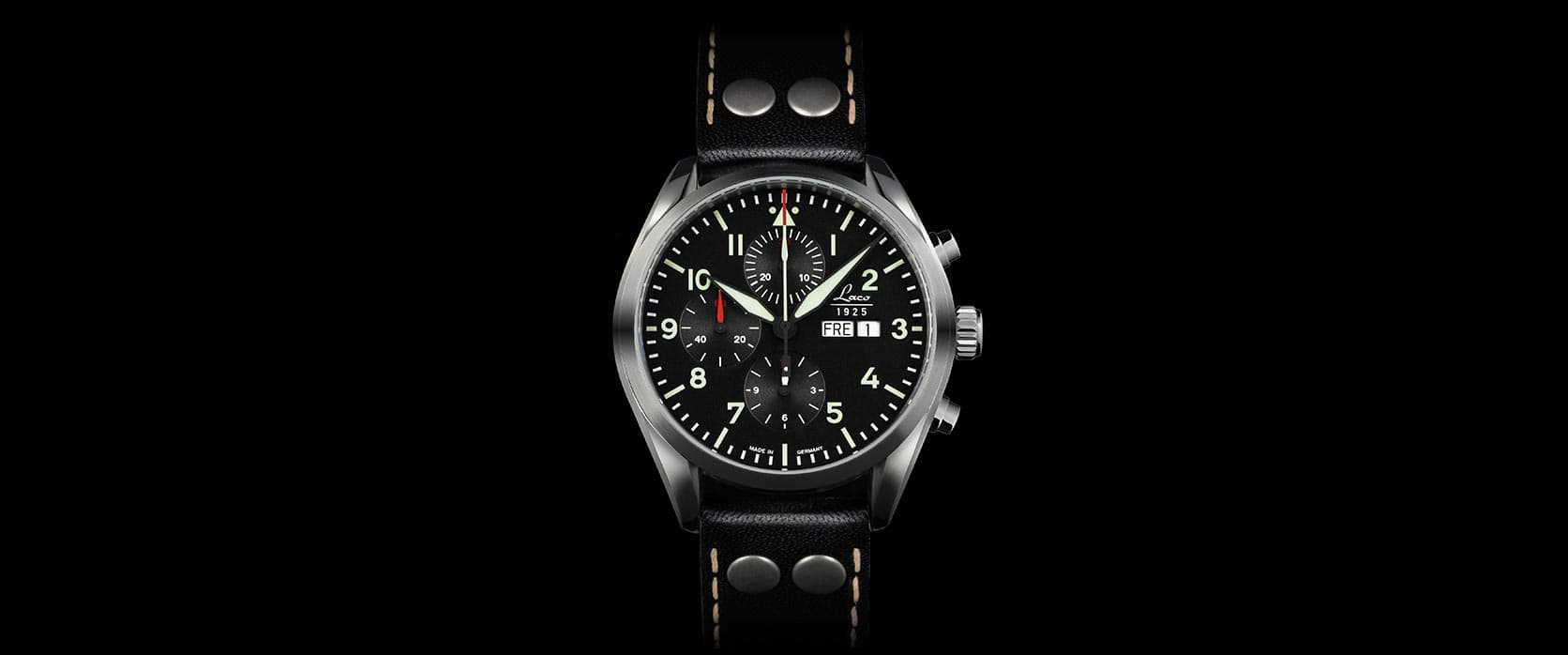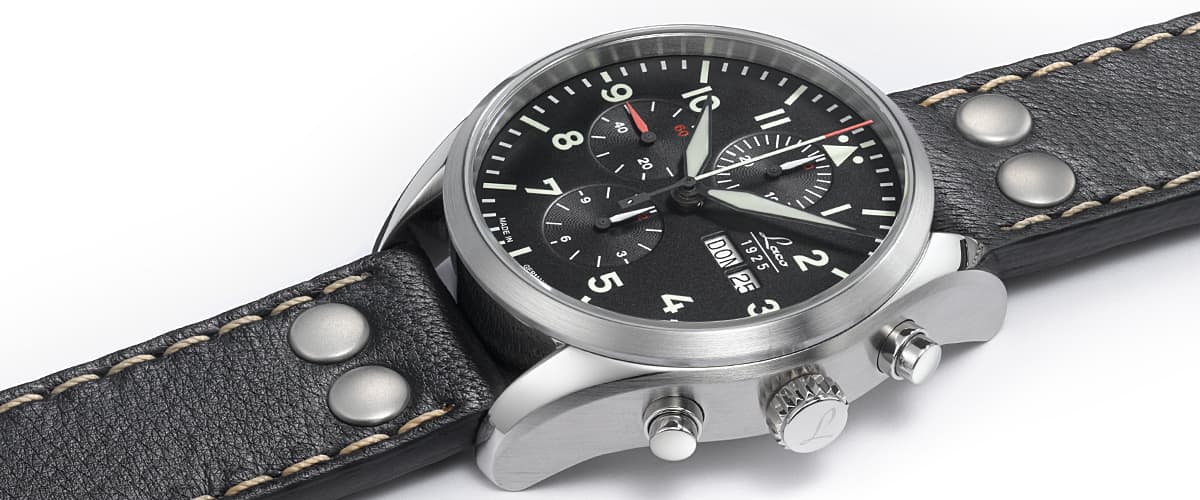 Pure technology, the LACO Chronograph leaves nothing to be desired. Day and date display, minute and hour counters, central second hand counter, and even a running sub-second dial.