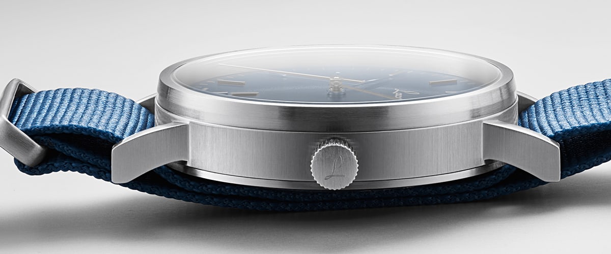 - Blue with sunray, 12 index and minutes, Bauhaus style