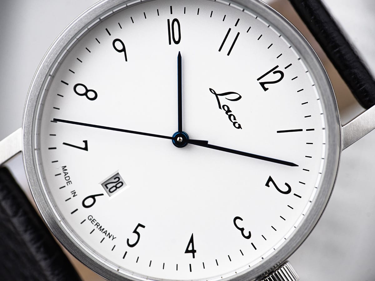 - Dial silver white, 12 numbers and minutes, Bauhaus style