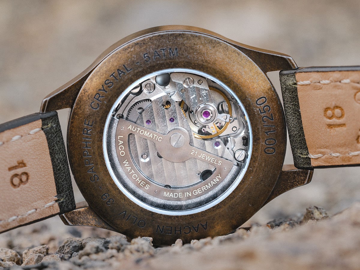 stainless steel case with bronze coloured PVD coating, sapphire crystal