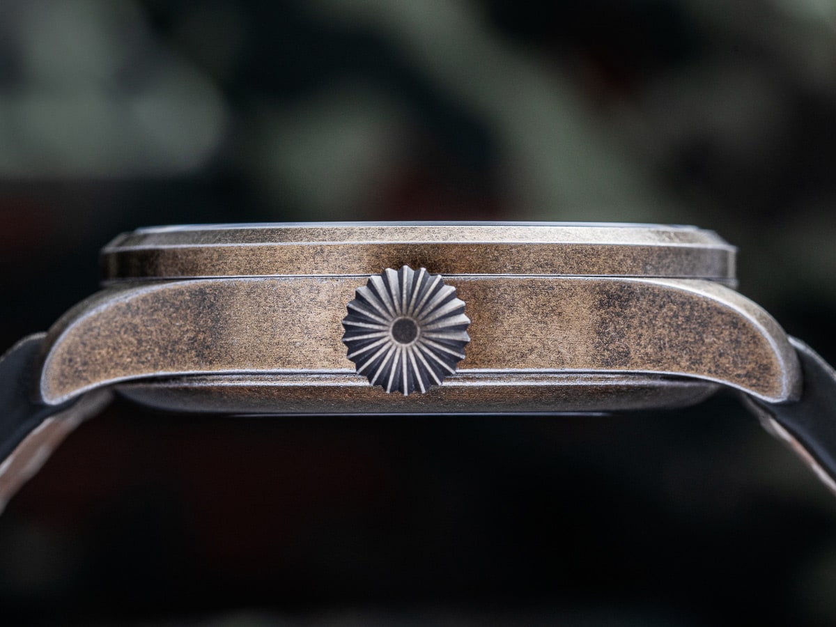 The stainless steel case measures 42 mm in diameter and has a bronze coloured PVD coating, further accentuating the "used" look of these watches. The harmonious appearance of these new designs is beautifully complemented by a sturdy strap made from vintage leather, which will develop an individual patina over time. In keeping with the pilot watch style, the strap features decorative rivets which, like the buckle, are colour coordinated with the case.
