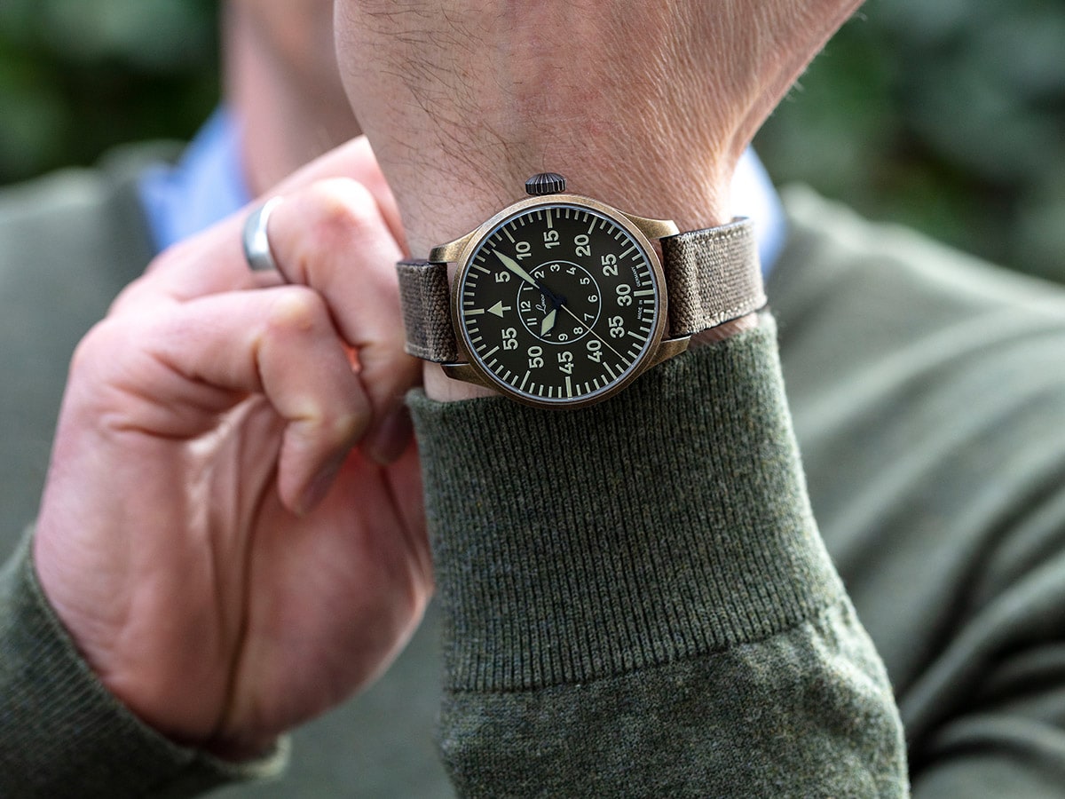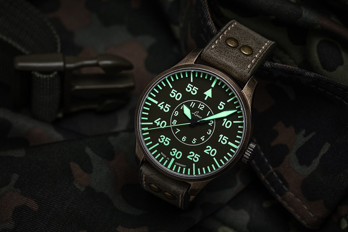 The olive dial features the perfect backdrop for the functional typography, with striking hands and numerals which has been associated with the well-known Laco navigator watches from the 1940s. In authentic style, the luminous colour used for the numbers and hands is Superluminova "Old Radium", which has a vintage brown shade during the day, but glows bright green in the dark.