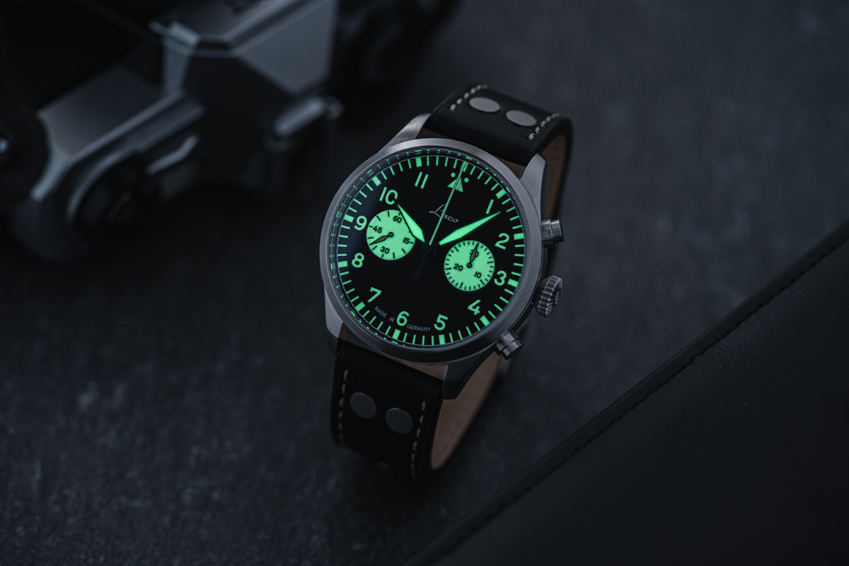 - Black dial, numerals and indices covered with Superluminova C3, totalisers at 3 and 9 o'clock completely covered with Superluminova C3