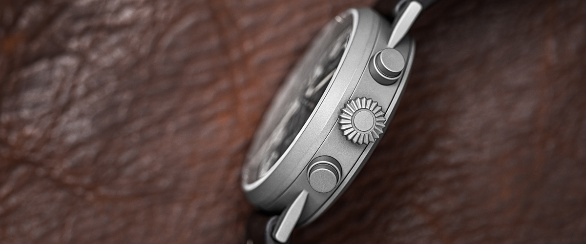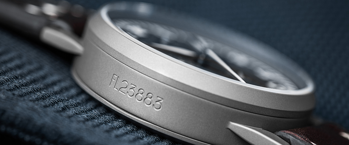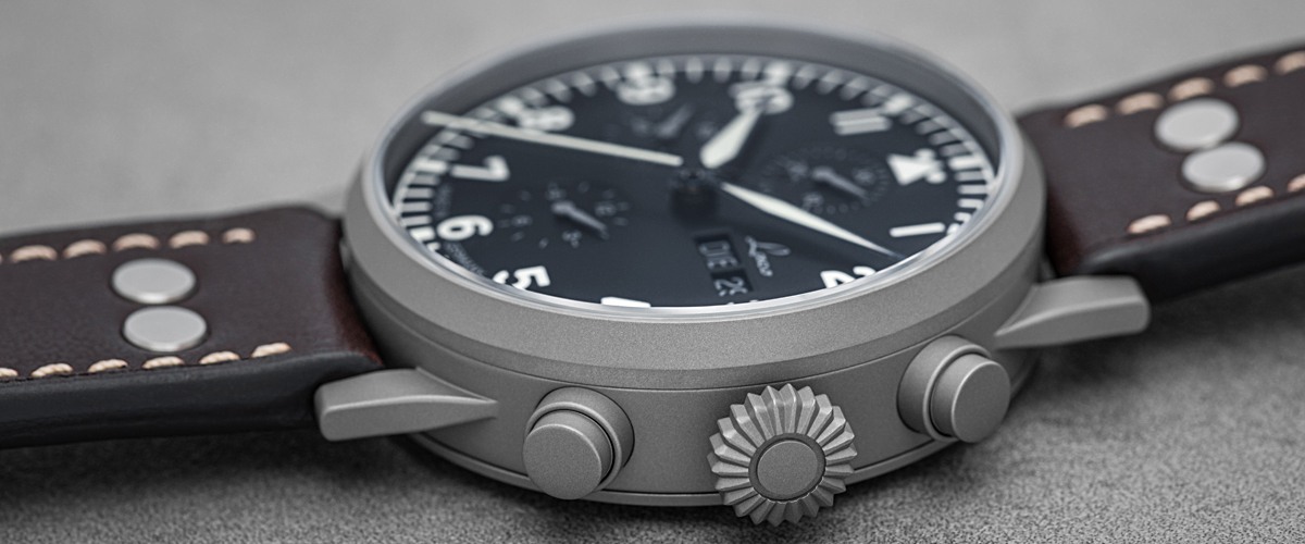 The robust stainless steel case is sandblasted to a matte titanium finish, increasing resilience and preventing unnecessary glare. The modern watch with its distinctive onion crown has a medium-sized diameter of 42.3 mm, making it suitable for many wearers. The core component is the rugged chronograph movement Laco 50, based on the Swiss ETA Valjoux 7750. An automatic movement that works behind an enclosed housing base whose engraved surface symbolizes the company´s long watchmaking history. The brown strap in smooth calfskin with light colored stitching and double riveting emphasizes this timepiece´s traditional appeal, which is not just for pilots!