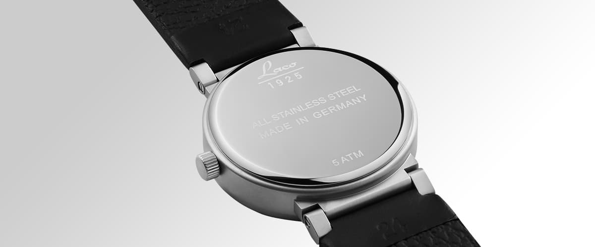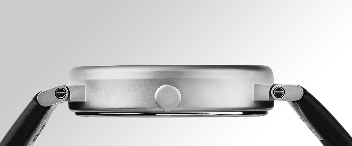 - Matt stainless steel case, flexible lugs, sapphire crystal, 5 ATM, case diameter 39 mm, hight 9,65 mm, closed case back