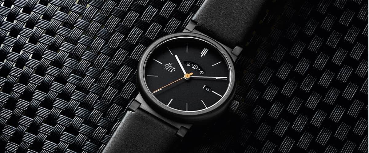 - Matt stainless steel case, flexible lugs, with black PVD plating, sapphire crystal, 5 ATM, case diameter 39 mm, hight 9,65 mm, closed case back