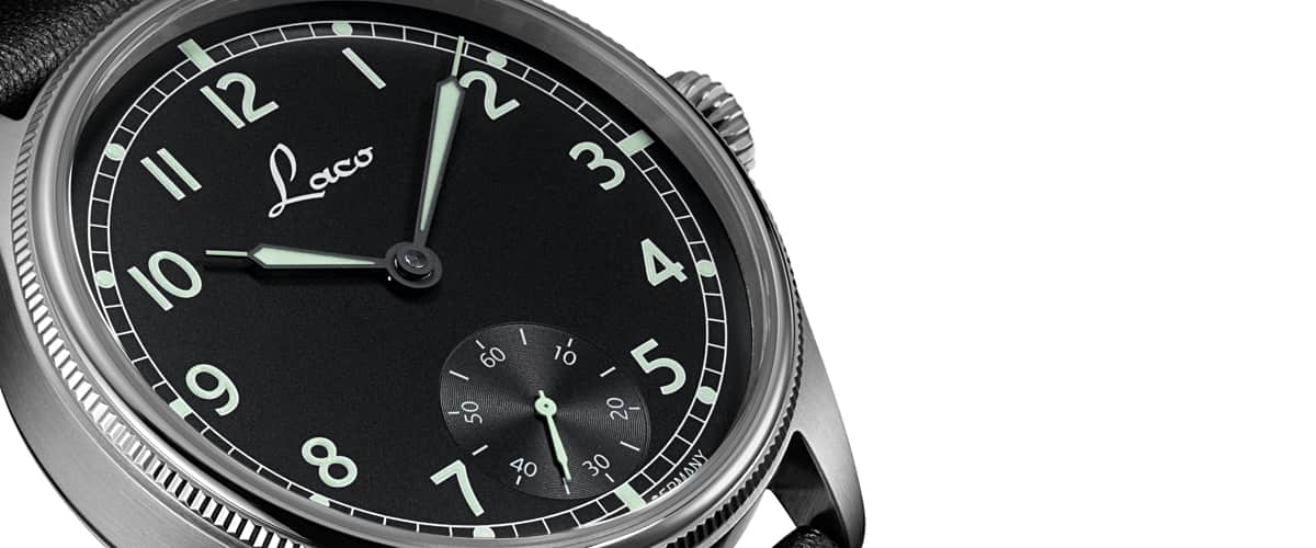 The advent of the new navy watch enables Laco to close the circle and present a modern wristwatch which combines the qualities of the two prototypes. For example, it includes a sturdy stainless steel casing, a subsidiary seconds display in the number 6 position, numerals and indices treated with afterglow Superluminova C3 paint and a wind-up calibre. The Laco 98 clockwork is based on the Swiss ETA 6498.1. Its high-grade components such as the thermally blued screws and various decorative cuts are visibly highlighted by the sapphire glass base.