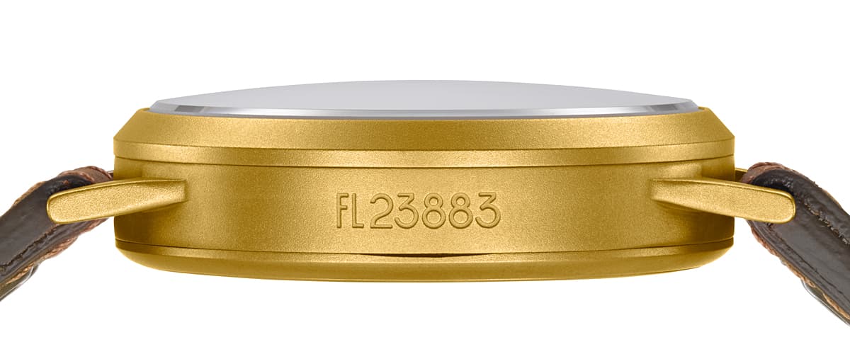 - sandblasted bronze case, with lateral engraving FL23883 and engraved stainless steel back, domed and anti-reflective sapphire crystal, solid case back with engraving, Crown execution like original Beobachtungsuhr