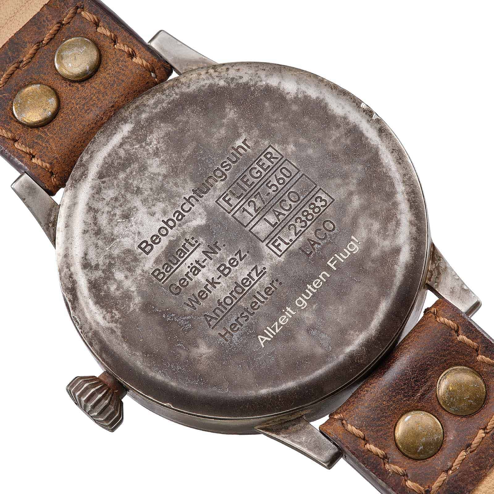 Stainless steel case, elaborately hand-finished in an antique look with lateral engraving FL23883 and engraved stainless steel back. Every case is absolutely unique. Domed and anti-reflective sapphire crystal, solid case back with engraving, Crown execution like original Beobachtungsuhr
