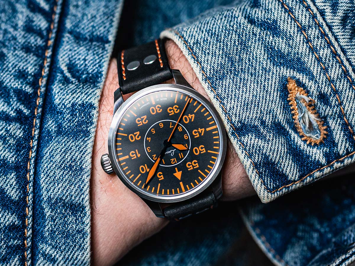 The "Neapel 39" and "Palermo 39" replicate the traditional pilot watch design, but with their bright orange numerals, indices and hands on a black background, they add a distinctly modern and more elegant touch. With the sophisticated colour combination, the two not only cut a good figure in the cockpit, but also unfold their charm in everyday life and in the business environment. The contemporary 39 mm stainless steel case with slim bezel frames the large dial, which - as befits a pilots watch - shows the time at a glance in all lighting conditions.