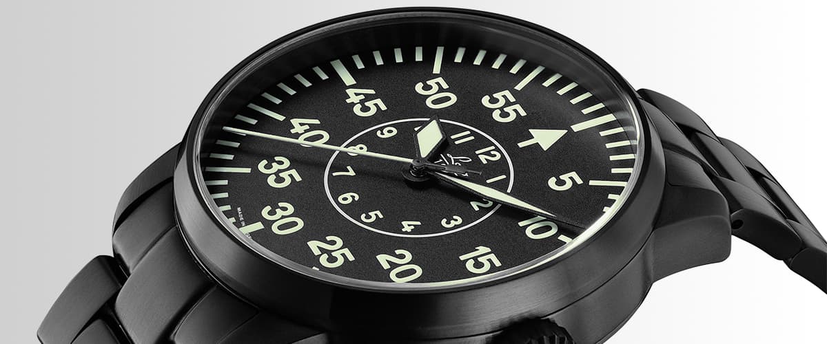 - Black mat with Superluminova indexes C3, execution according B-Uhr Baumuster B