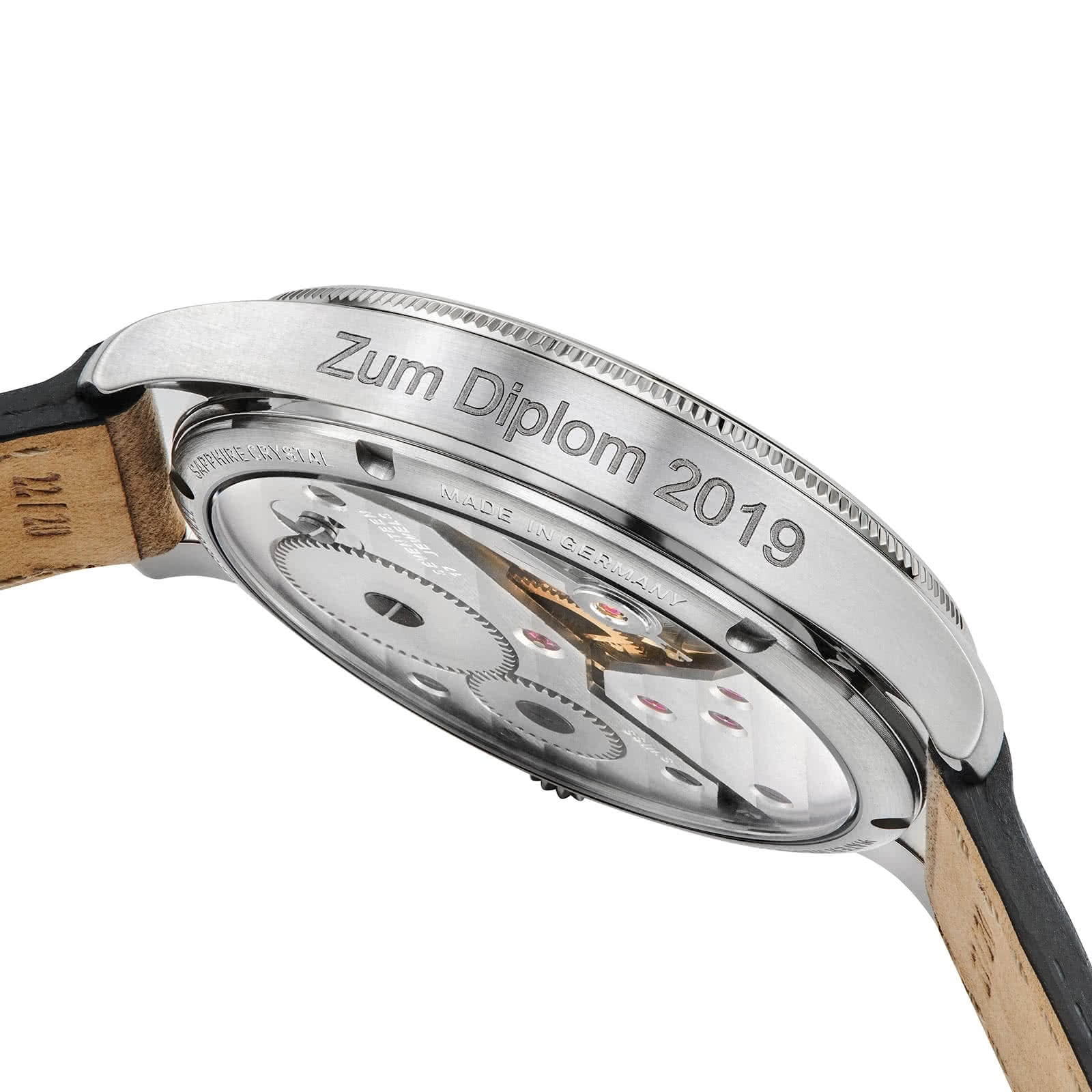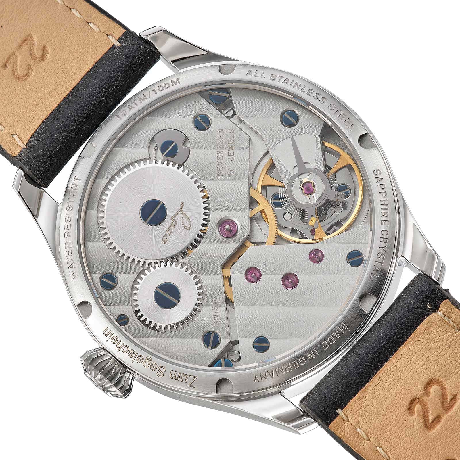 handwinding movement Laco 98 bridges with Côtes de Genève, thermical blued screws, ratchet wheel and crown wheel with sun ray finish, ratchet wheel with engraved Laco Logo