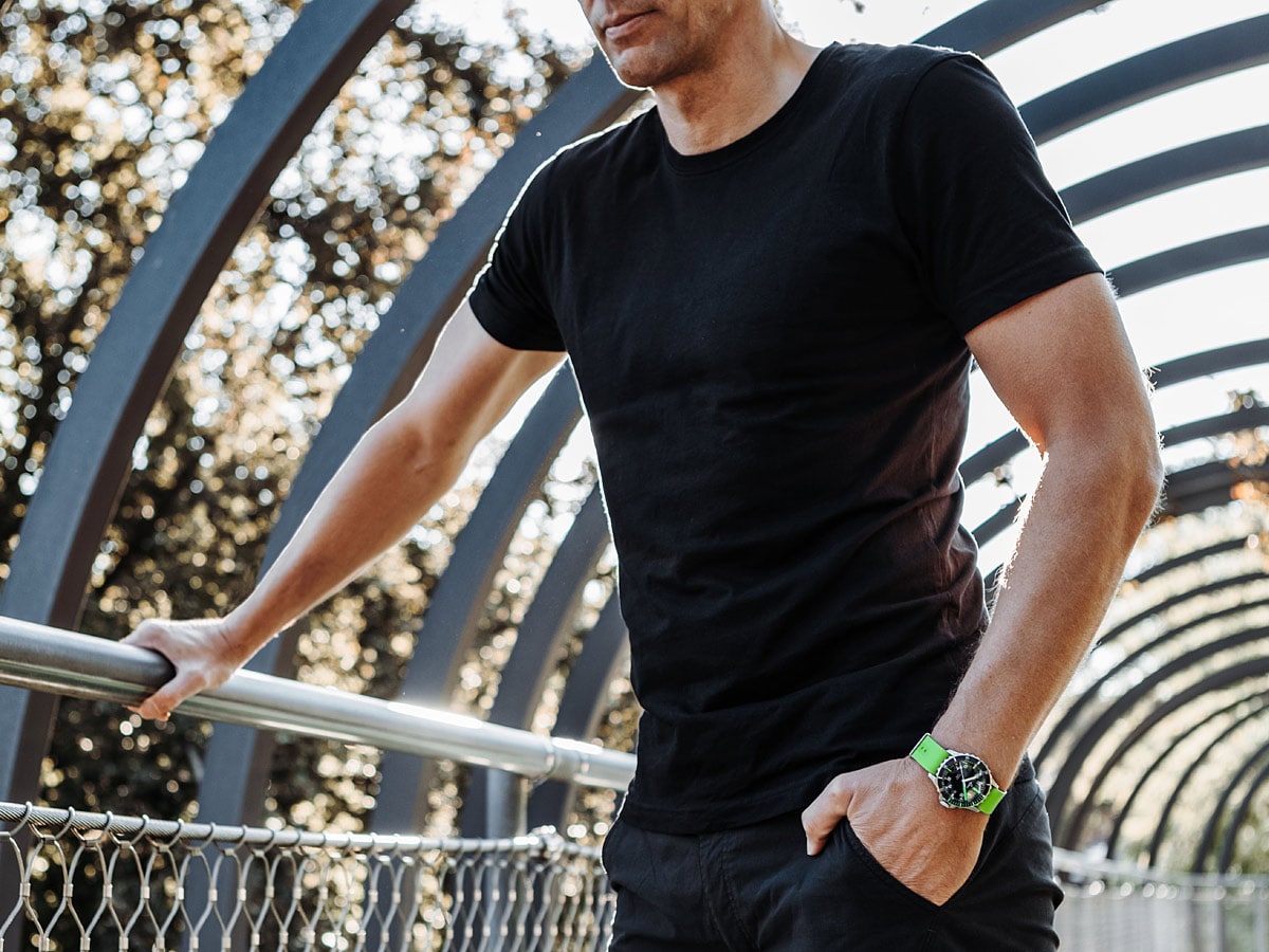 The four timekeepers of the product range share the same black dial with white arabic numerals as well as the shape of their casing. Depending on the model they differ in their visual colour accents, with the black, unidirectional bezel, the indices and the minute hand being coated in luminous Superluminova paint in white, green, blue, or orange. The long-lasting afterglow effect ensures optimal readability in low lighting conditions or even complete darkness. This is another aspect where the scorpion analogy is appropriate: the scorpion produces fluorescent materials that make it visible at night under UV lighting.