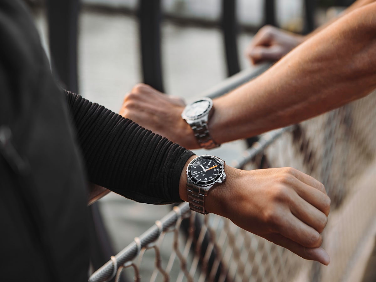 The four timekeepers of the product range share the same black dial with white arabic numerals as well as the shape of their casing. Depending on the model they differ in their visual colour accents, with the black, unidirectional bezel, the indices and the minute hand being coated in luminous Superluminova paint in white, green, blue, or orange. The long-lasting afterglow effect ensures optimal readability in low lighting conditions or even complete darkness. This is another aspect where the scorpion analogy is appropriate: the scorpion produces fluorescent materials that make it visible at night under UV lighting.