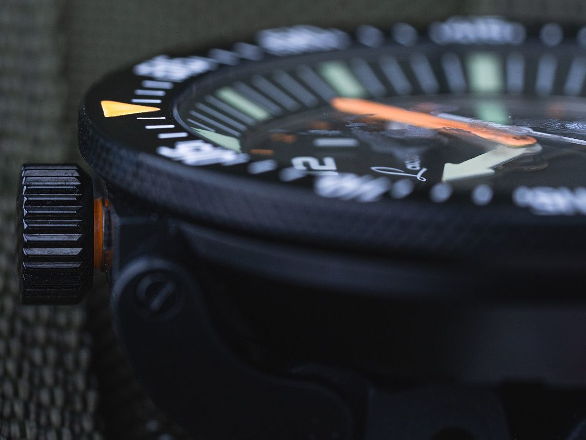 flat sapphire crystal, screwed crown at 12 h, unidirectional rotating countdown bezel (stainless steel), flexible end pieces, screwed stainless steel case back - Dial: