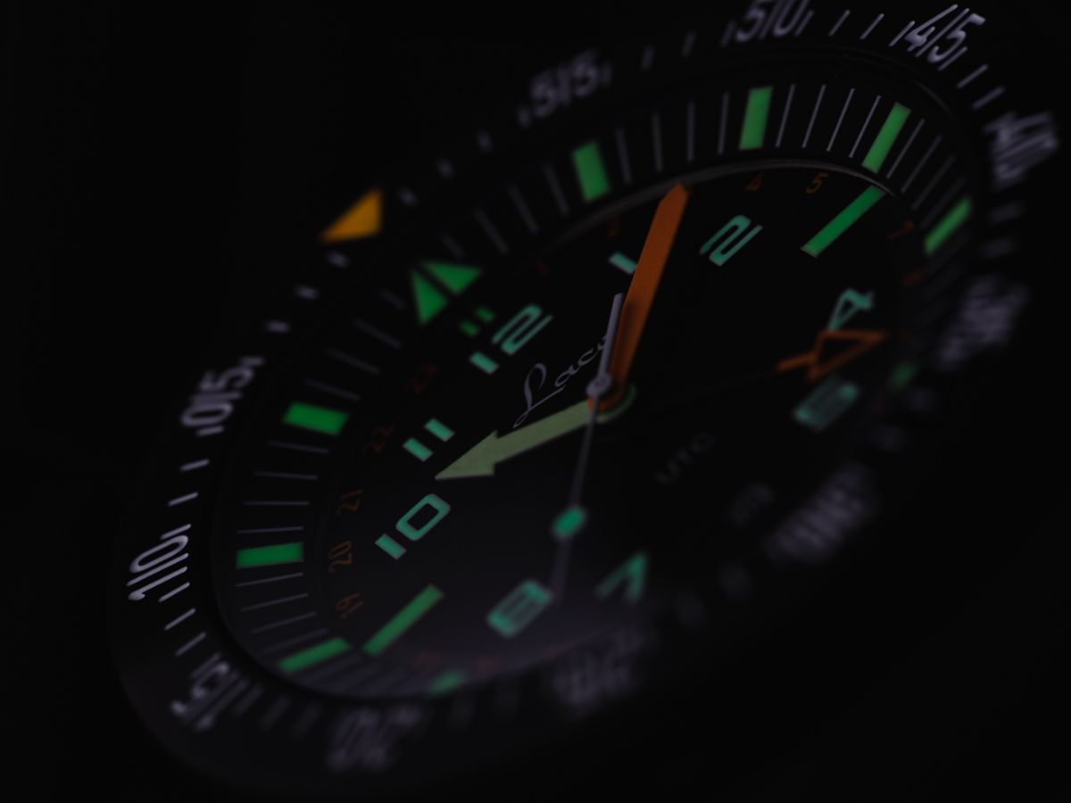 - Hour hand filled with luminous material Superluminova C3, minute hand filled with Superluminova orange, second hand white and filled with Superluminova C3, UTC hand with skeletonized arrowhead covered with Superluminova orange